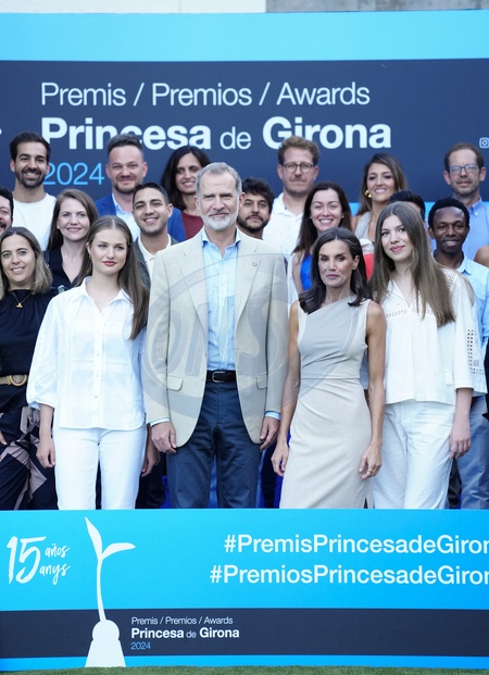 la princesse héritière Leonor, Le roi Felipe VI d'Espagne, la reine Letizia, l'infante Sofia arrivant à l'hôtel Melia Lloret de Mar pour une réception en l'honneur des lauréats du prix Princesse de Gérone (Princess of Girona awards) le 9 juillet 2024. King Felipe VI , Queen Letizia, Crown Princess Leonor and Princess Sofia receive previous Princess of Girona awards winners at the Melia Lloret de Mar Hotel. Lloret del Mar, Girona - July 9, 2024