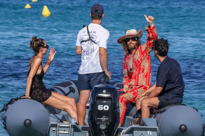 Jared Leto et Sofia Boutella sortent du club 55 à Saint-Tropez, Côte d'Azur, France, le 10 juillet 2024. Jared prend ensuite un zodiac avec des amis et perd son chapeau dans l'eau mais heureusement il le récupère légèrement mouillé... Jared Leto and Sofia Boutella leave Club 55 in Saint-Tropez, French Riviera, France on July 10, 2024. Jared then takes a zodiac with friends and loses his hat in the water but luckily he recovers it slightly wet...