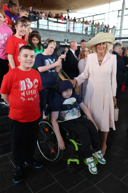 CARDIFF, WALES - JULY 11: Queen Camilla poses with children of the ‚ÄňAny Body Can Choir‚Äô before she and King Charles III depart after a visit to the Senedd on July 11, 2024 in Cardiff, Wales. Their Majesties The King and Queen visit the Senedd on the occasion of its twenty-fifth anniversary., Credit:Chris Jackson / Avalon
