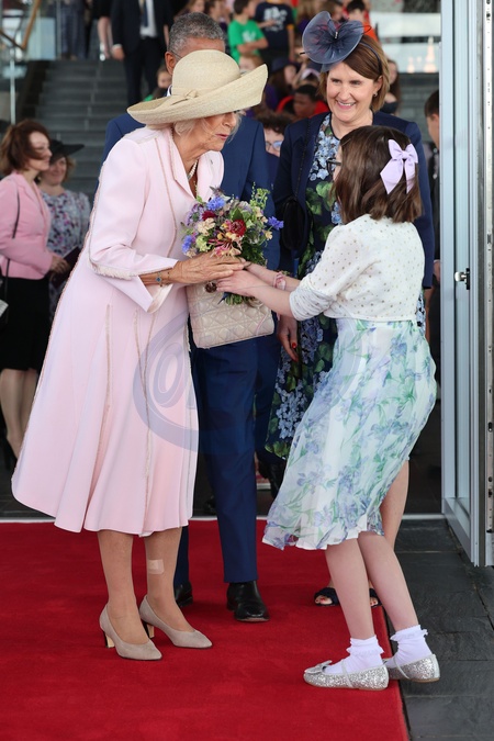 CARDIFF, WALES - JULY 11: Queen Camilla receives a flower bouquet by a young girl before she and King Charles III depart after a visit to the Senedd on July 11, 2024 in Cardiff, Wales. Their Majesties The King and Queen visit the Senedd on the occasion of its twenty-fifth anniversary., Credit:Chris Jackson / Avalon