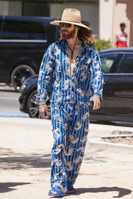 Jared Leto se balade sur le port de Saint-Tropez, Côte d'Azur, France, le 11 juillet 2024. Jared Leto walks around the harbor in Saint-Tropez, French Riviera, France, July 11, 2024.