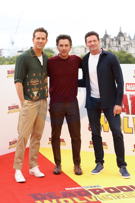 Ryan Reynolds, Shawn Levy and Hugh Jackman at the Deadpool & Wolverine UK Photocall held at at The Savoy London in London, UK, on 12th July, 2024, Credit:James Shaw / Avalon