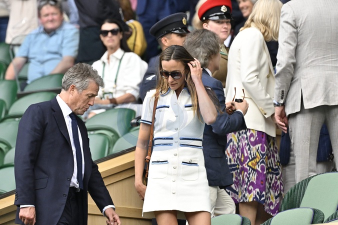 Hugh Grant and his wife Anna Elisabet Eberstein in the stands during the day twelve of the Wimbledon Tennis Championships at the All England Lawn Tennis and Croquet Club on July 11, 2024 in London, England. © Chryslene Caillaud/Panoramic/Bestimage