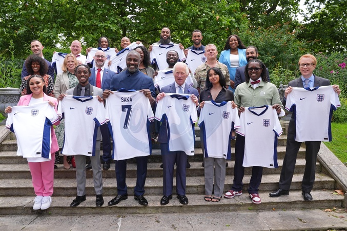 King Charles III (centre) with Idris Elba (centre left) and young people hold England football team shirts in support of the England football team as they attend an event for The King's Trust to discuss youth opportunity, at St James's Palace in central London. The King and Mr Elba, an alumnus of The King's Trust (formerly known as The Prince's Trust), are meeting about the charity's ongoing work to support young people, and creating positive opportunities and initiatives which might help address youth violence in the UK, as well as the collaboration in Sierra Leone between the Prince's Trust International and the Elba Hope Foundation., Credit:Yui Mok / Avalon