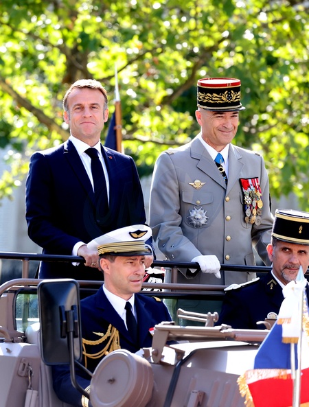 Prezydent Republiki Francuskiej Emmanuel Macron w towarzystwie generała Thierry’ego Burkharda, szefa sztabu sił zbrojnych, na pokładzie „samochodu dowodzenia” podczas ceremonii 144. defilady wojskowej 14 lipca, w Święto Narodowe, w Paryżu
