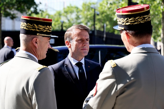 Prezydent Republiki Francuskiej Emmanuel Macron w towarzystwie generała Thierry’ego Burkharda, szefa sztabu sił zbrojnych, na pokładzie „samochodu dowodzenia” podczas ceremonii 144. defilady wojskowej 14 lipca, w Święto Narodowe, w Paryżu