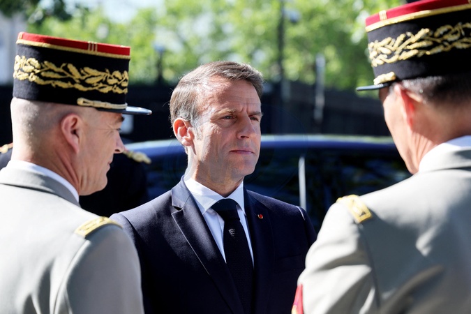 Prezydent Republiki Francuskiej Emmanuel Macron w towarzystwie generała Thierry’ego Burkharda, szefa sztabu sił zbrojnych, na pokładzie „samochodu dowodzenia” podczas ceremonii 144. defilady wojskowej 14 lipca, w Święto Narodowe, w Paryżu