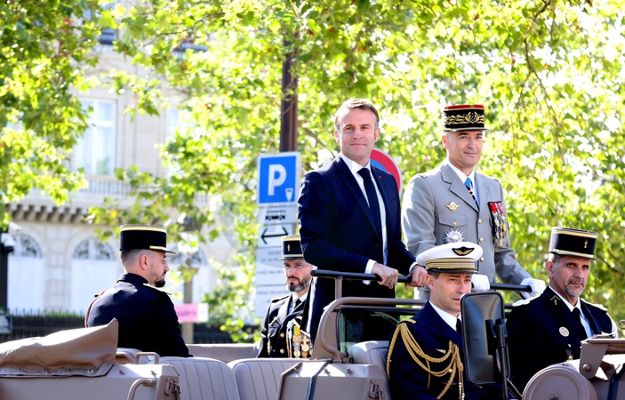 Prezydent Republiki Francuskiej Emmanuel Macron w towarzystwie generała Thierry’ego Burkharda, szefa sztabu sił zbrojnych, na pokładzie „samochodu dowodzenia” podczas ceremonii 144. defilady wojskowej 14 lipca, w Święto Narodowe, w Paryżu