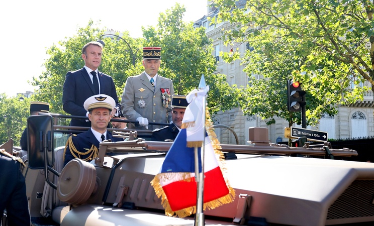 Prezydent Republiki Francuskiej Emmanuel Macron w towarzystwie generała Thierry’ego Burkharda, szefa sztabu sił zbrojnych, na pokładzie „samochodu dowodzenia” podczas ceremonii 144. defilady wojskowej 14 lipca, w Święto Narodowe, w Paryżu