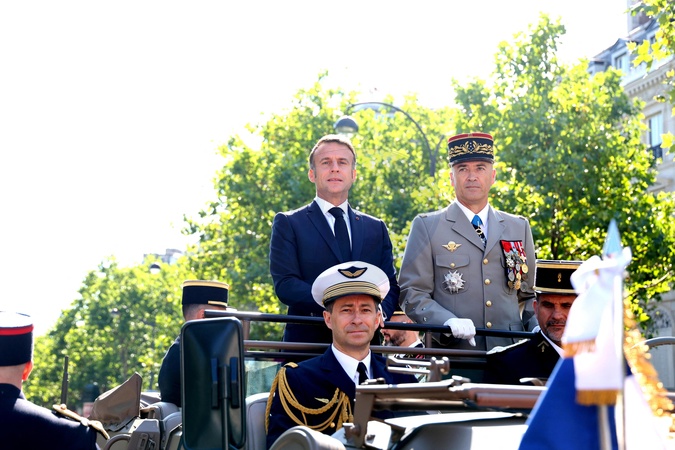 Prezydent Republiki Francuskiej Emmanuel Macron w towarzystwie generała Thierry’ego Burkharda, szefa sztabu sił zbrojnych, na pokładzie „samochodu dowodzenia” podczas ceremonii 144. defilady wojskowej 14 lipca, w Święto Narodowe, w Paryżu