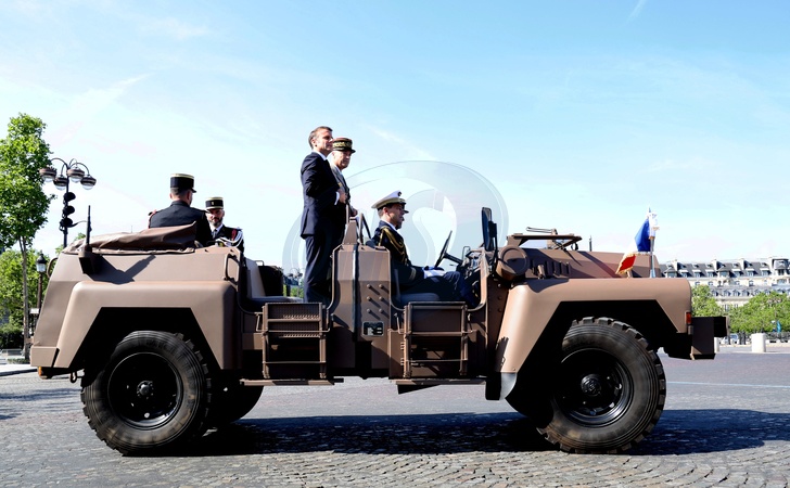 Le président de la République française Emmanuel Macron, accompagné du général Thierry Burkhard, chef d'état-major des armées à bord d'un véhicule léger de reconnaissance et de soutien (VLRA) "command car" lors de la cérémonie du 144ème défilé militaire du 14 juillet, jour de la Fête Nationale à Paris, France, le 14 juillet 2024. © Dominique Jacovides/Bestimage French President and Chief of Staff of the French Armed Forces (CEMA) during the Bastille Day parade, in Paris, France., on July 14, 2024.
