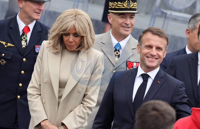 Prezydent Emmanuel Macron i jego żona Pierwsza Dama Brigitte Macron podczas spaceru po zakończeniu ceremonii 144. defilady wojskowej 14 lipca, w Święto Narodowe, w Paryżu