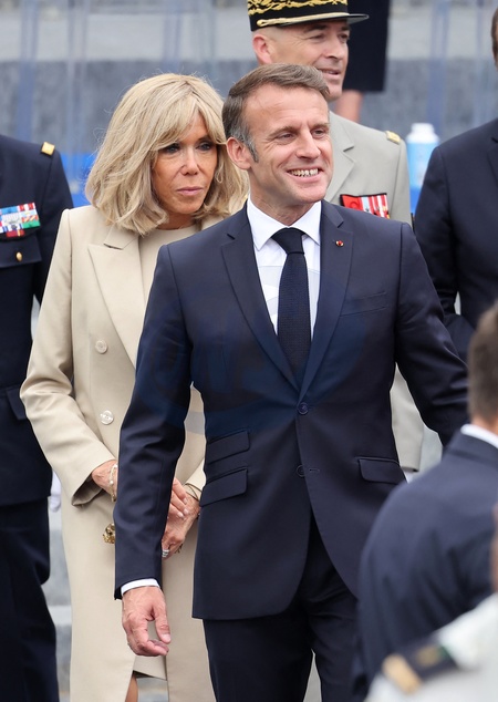 Prezydent Emmanuel Macron i jego żona Pierwsza Dama Brigitte Macron podczas spaceru po zakończeniu ceremonii 144. defilady wojskowej 14 lipca, w Święto Narodowe, w Paryżu