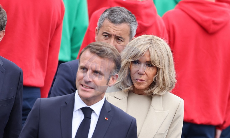 Le président Emmanuel Macron et sa femme la Première Dame Brigitte Macron lors d'un bain de foule à l'issue de la cérémonie du 144ème défilé militaire du 14 juillet, jour de la Fête Nationale, à Paris