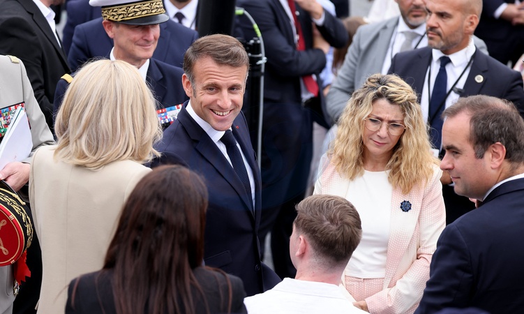 Le président de la République française Emmanuel Macron et sa femme la Première Dame française Brigitte Macron avec Sébastien Lecornu, ministre des Armées, lors d'un bain de foule à la cérémonie du 144ème défilé militaire du 14 juillet, jour de la Fête Nationale, à Paris, France, le 14 juillet 2024. © Dominique Jacovides/Bestimage rench President during the Bastille Day parade, in Paris, France, on July 14, 2024.