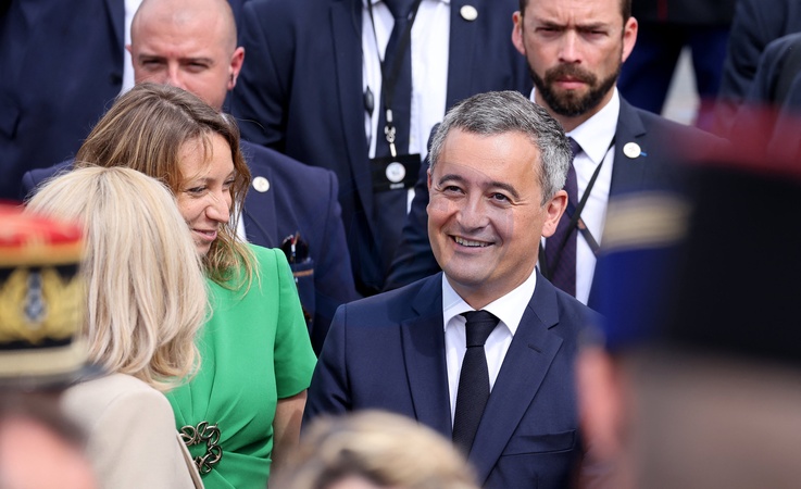 La Première Dame française Brigitte Macron, Gérald Darmanin, ministre de l'Intérieur et des Outre-mer, et sa femme Rose-Marie Devillers lors d'un bain de foule à la cérémonie du 144ème défilé militaire du 14 juillet, jour de la Fête Nationale, à Paris, France, le 14 juillet 2024. © Dominique Jacovides/Bestimage rench President during the Bastille Day parade, in Paris, France, on July 14, 2024.