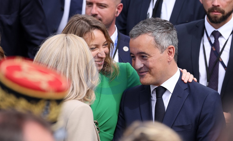La Première Dame française Brigitte Macron, Gérald Darmanin, ministre de l'Intérieur et des Outre-mer, et sa femme Rose-Marie Devillers lors d'un bain de foule à la cérémonie du 144ème défilé militaire du 14 juillet, jour de la Fête Nationale, à Paris, France, le 14 juillet 2024. © Dominique Jacovides/Bestimage rench President during the Bastille Day parade, in Paris, France, on July 14, 2024.
