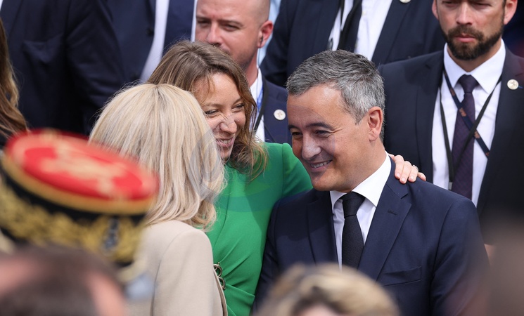 La Première Dame française Brigitte Macron, Gérald Darmanin, ministre de l'Intérieur et des Outre-mer, et sa femme Rose-Marie Devillers lors d'un bain de foule à la cérémonie du 144ème défilé militaire du 14 juillet, jour de la Fête Nationale, à Paris, France, le 14 juillet 2024. © Dominique Jacovides/Bestimage rench President during the Bastille Day parade, in Paris, France, on July 14, 2024.