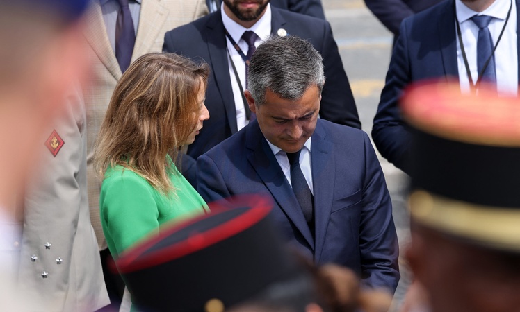 Gérald Darmanin, ministre de l'Intérieur et des Outre-mer, et sa femme Rose-Marie Devillers lors d'un bain de foule à la cérémonie du 144ème défilé militaire du 14 juillet, jour de la Fête Nationale, à Paris, France, le 14 juillet 2024. © Dominique Jacovides/Bestimage rench President during the Bastille Day parade, in Paris, France, on July 14, 2024.