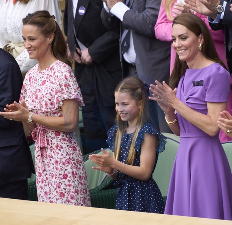 Catherine, Princess of Wales in the Royal box with Daughter Princess Charlotte and sister Pippa during the men's final on centre court between Carlos Alcaraz (ESP) and Novak Djokovic (SRB) at the 2024 Wimbledon Championships at The All England Club, London, United Kingdom , 14 July 2024, Credit:Peter van den Berg / Avalon