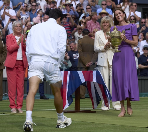Catherine, Princess of Wales smiles as she presents the winners trophy to Carlos Alcaraz (ESP) at the 2024 Wimbledon Championships at The All England Club, London, United Kingdom , 14 July 2024, Credit:Peter van den Berg / Avalon