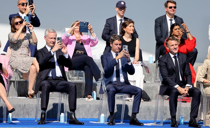 Bruno Le Maire, Sylvie Retailleau, Gabriel Attal, Amélie Oudea-Castera, Prisca Thévenot, Emmanuel Macron en tribune présidentielle lors de la cérémonie du 144ème défilé militaire du 14 juillet, jour de la Fête Nationale, avenue Foch à Paris, France, le 14 juillet 2024. © Dominique Jacovides/Bestimage French President, his wife and Ministers during the Bastille Day parade, in Paris, France, on July 14, 2024.