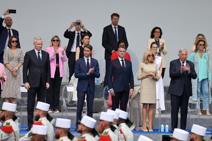 Bruno Le Maire, Sylvie Retailleau, Gabriel Attal, Amélie Oudea-Castera, Franck Riester, Prisca Thévenot, Aurore Bergé, Emmanuel Macron et sa Brigitte, Gérard Larcher en tribune présidentielle lors de la cérémonie du 144ème défilé militaire du 14 juillet, jour de la Fête Nationale, avenue Foch à Paris, France, le 14 juillet 2024. © Dominique Jacovides/Bestimage French President, his wife and Ministers during the Bastille Day parade, in Paris, France, on July 14, 2024.