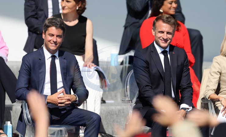 Gabriel Attal, Emmanuel Macron en tribune présidentielle lors de la cérémonie du 144ème défilé militaire du 14 juillet, jour de la Fête Nationale, avenue Foch à Paris, France, le 14 juillet 2024. © Dominique Jacovides/Bestimage French President, his wife and Ministers during the Bastille Day parade, in Paris, France, on July 14, 2024.