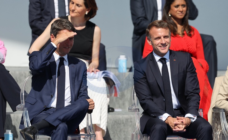 Gabriel Attal, Emmanuel Macron en tribune présidentielle lors de la cérémonie du 144ème défilé militaire du 14 juillet, jour de la Fête Nationale, avenue Foch à Paris, France, le 14 juillet 2024. © Dominique Jacovides/Bestimage French President, his wife and Ministers during the Bastille Day parade, in Paris, France, on July 14, 2024.