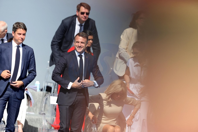 Gabriel Attal, Emmanuel Macron en tribune présidentielle lors de la cérémonie du 144ème défilé militaire du 14 juillet, jour de la Fête Nationale, avenue Foch à Paris, France, le 14 juillet 2024. © Dominique Jacovides/Bestimage French President, his wife and Ministers during the Bastille Day parade, in Paris, France, on July 14, 2024.