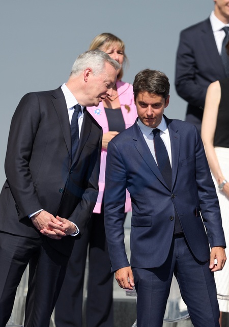 Bruno Le Maire, Gabriel Attal en tribune présidentielle lors de la cérémonie du 144ème défilé militaire du 14 juillet, jour de la Fête Nationale, avenue Foch à Paris, France, le 14 juillet 2024. © Dominique Jacovides/Bestimage French President, his wife and Ministers during the Bastille Day parade, in Paris, France, on July 14, 2024.