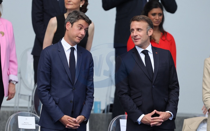 Gabriel Attal, Emmanuel Macron en tribune présidentielle lors de la cérémonie du 144ème défilé militaire du 14 juillet, jour de la Fête Nationale, avenue Foch à Paris, France, le 14 juillet 2024. © Dominique Jacovides/Bestimage French President, his wife and Ministers during the Bastille Day parade, in Paris, France, on July 14, 2024.