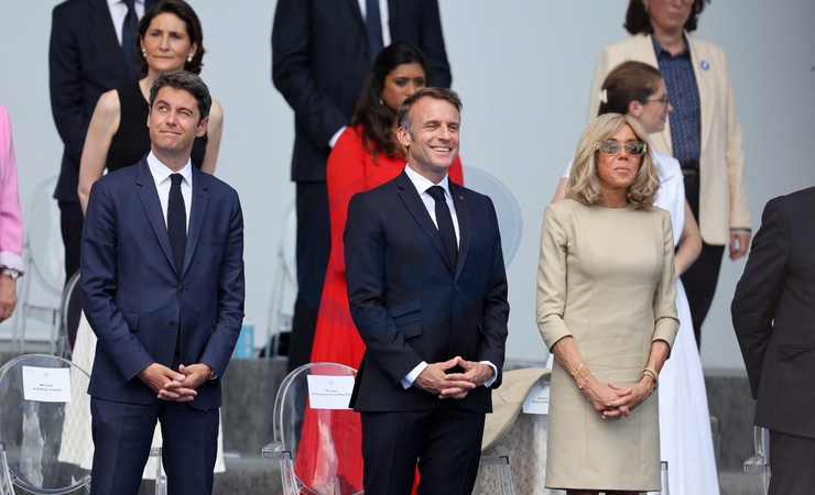 Gabriel Attal, Emmanuel Macron et sa femme Brigitte en tribune présidentielle lors de la cérémonie du 144ème défilé militaire du 14 juillet, jour de la Fête Nationale, avenue Foch à Paris, France, le 14 juillet 2024. © Dominique Jacovides/Bestimage French President, his wife and Ministers during the Bastille Day parade, in Paris, France, on July 14, 2024.