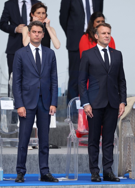 Gabriel Attal, Emmanuel Macron en tribune présidentielle lors de la cérémonie du 144ème défilé militaire du 14 juillet, jour de la Fête Nationale, avenue Foch à Paris, France, le 14 juillet 2024. © Dominique Jacovides/Bestimage French President, his wife and Ministers during the Bastille Day parade, in Paris, France, on July 14, 2024.