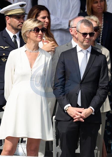 Alexis Kohler et sa femme Sylvie Schirm en tribune présidentielle lors de la cérémonie du 144ème défilé militaire du 14 juillet, jour de la Fête Nationale, avenue Foch à Paris, France, le 14 juillet 2024. © Dominique Jacovides/Bestimage French President, his wife and Ministers during the Bastille Day parade, in Paris, France, on July 14, 2024.
