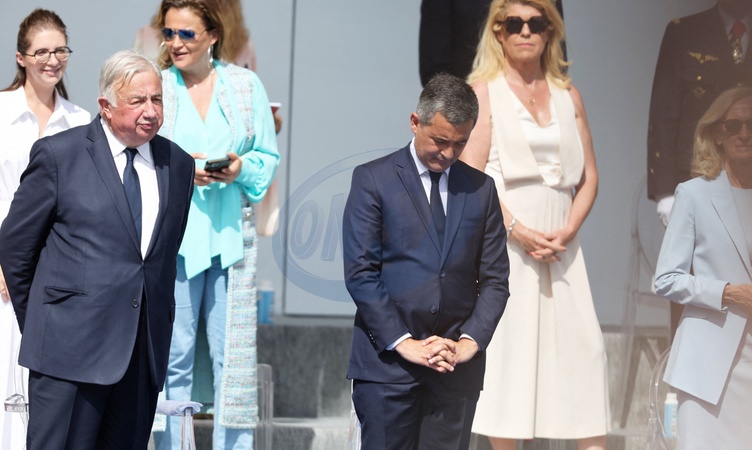 Gérard Larcher, Gérald Darmanin en tribune présidentielle lors de la cérémonie du 144ème défilé militaire du 14 juillet, jour de la Fête Nationale, avenue Foch à Paris, France, le 14 juillet 2024. © Dominique Jacovides/Bestimage French President, his wife and Ministers during the Bastille Day parade, in Paris, France, on July 14, 2024.