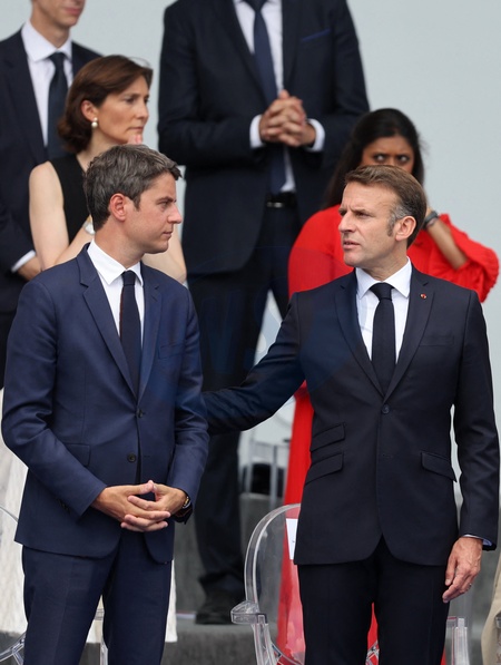 Gabriel Attal, Emmanuel Macron en tribune présidentielle lors de la cérémonie du 144ème défilé militaire du 14 juillet, jour de la Fête Nationale, avenue Foch à Paris, France, le 14 juillet 2024. © Dominique Jacovides/Bestimage French President, his wife and Ministers during the Bastille Day parade, in Paris, France, on July 14, 2024.