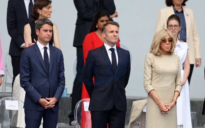 Gabriel Attal, Emmanuel Macron, Brigitte Macron en tribune présidentielle lors de la cérémonie du 144ème défilé militaire du 14 juillet, jour de la Fête Nationale, avenue Foch à Paris, France, le 14 juillet 2024. © Dominique Jacovides/Bestimage French President, his wife and Ministers during the Bastille Day parade, in Paris, France, on July 14, 2024.