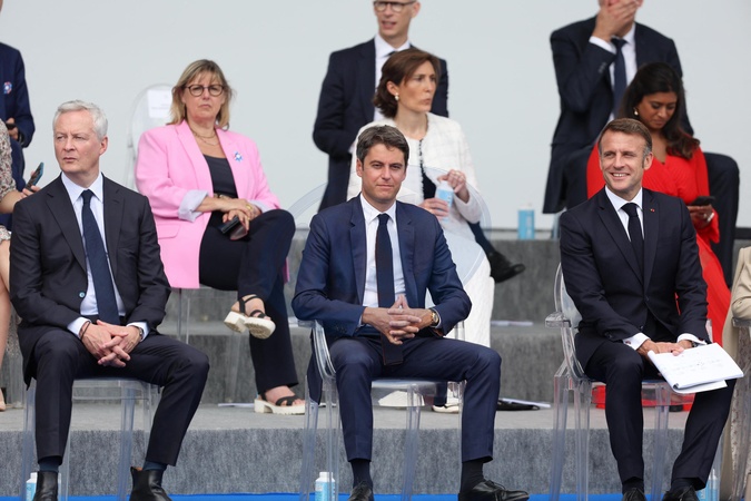 Bruno Le Maire, Gabriel Attal, Emmanuel Macron, Sylvie Retailleau, Franck Riester, Amélie Oudéa-Castéra, Prisca Thevenot en tribune présidentielle lors de la cérémonie du 144ème défilé militaire du 14 juillet, jour de la Fête Nationale, avenue Foch à Paris, France, le 14 juillet 2024. © Dominique Jacovides/Bestimage French President, his wife and Ministers during the Bastille Day parade, in Paris, France, on July 14, 2024.