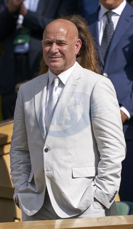 Andre Agassi in the Royal box during the men's final on centre court between Carlos Alcaraz (ESP) and Novak Djokovic (SRB) at the 2024 Wimbledon Championships at The All England Club, London, United Kingdom , 14 July 2024, Credit:Peter van den Berg / Avalon