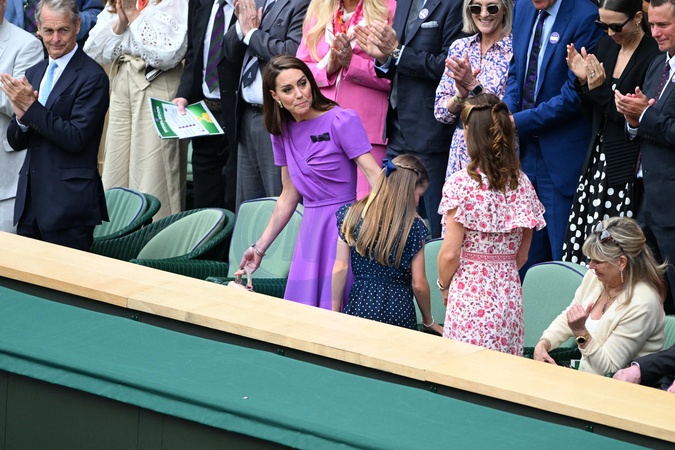 Catherine (Kate) Middleton avec la princesse Charlotte et Pippa Middleton dans les tribunes de la finale du tournoi de Wimbledon 2024, le 14 juillet 2024. Catherine (Kate) Middleton with Princess Charlotte and Pippa Middleton in the stands of the final of the 2024 Wimbledon tournament, July 14, 2024.
