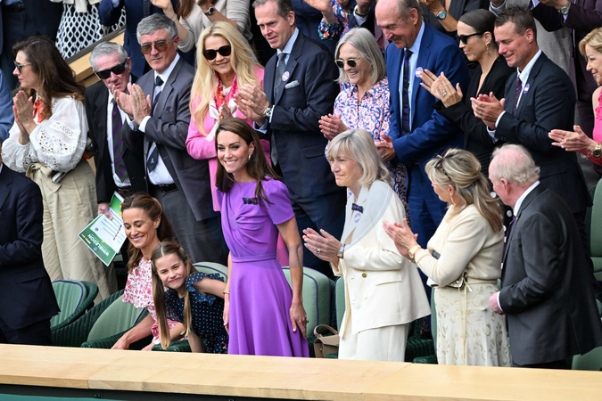 Catherine (Kate) Middleton avec la princesse Charlotte et Pippa Middleton dans les tribunes de la finale du tournoi de Wimbledon 2024, le 14 juillet 2024. Catherine (Kate) Middleton with Princess Charlotte and Pippa Middleton in the stands of the final of the 2024 Wimbledon tournament, July 14, 2024.
