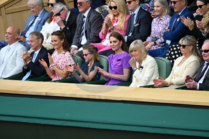Catherine (Kate) Middleton avec la princesse Charlotte et Pippa Middleton dans les tribunes de la finale du tournoi de Wimbledon 2024, le 14 juillet 2024. Catherine (Kate) Middleton with Princess Charlotte and Pippa Middleton in the stands of the final of the 2024 Wimbledon tournament, July 14, 2024.