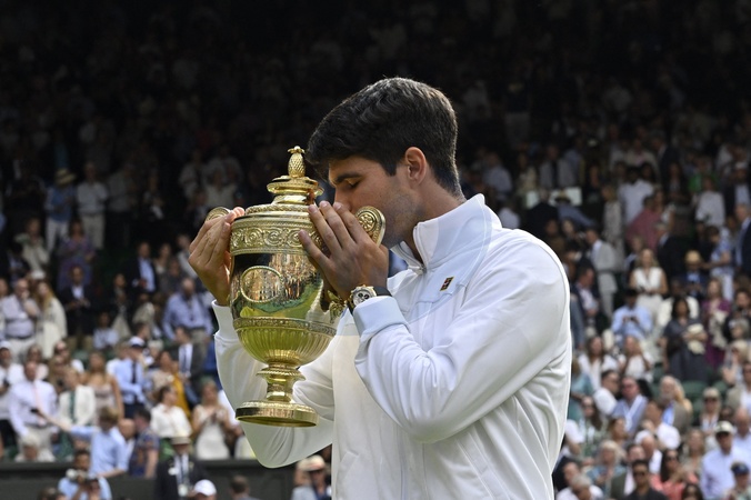 Catherine (Kate) Middleton wręcza puchar Carlosowi Alcarazowi po jego zwycięstwie nad Novakiem Djokoviciem w finale turnieju Wimbledonu 2024 (6.2. - 6.2. - 7.6