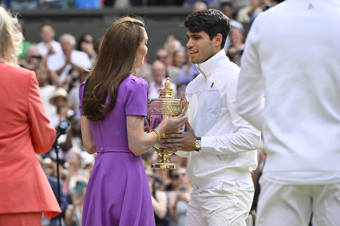 Catherine (Kate) Middleton remet la coupe à Carlos Alcaraz après sa victoire face à Novak Djokovic en finale du tournoi de Wimbledon 2024 (6/2 - 6/2 - 7/6)