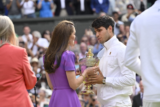 Catherine (Kate) Middleton wręcza puchar Carlosowi Alcarazowi po jego zwycięstwie nad Novakiem Djokoviciem w finale turnieju Wimbledonu 2024 (6.2. - 6.2. - 7.6