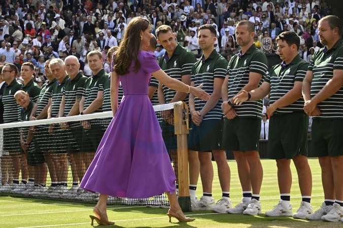 Catherine (Kate) Middleton wręcza puchar Carlosowi Alcarazowi po jego zwycięstwie nad Novakiem Djokoviciem w finale turnieju Wimbledonu 2024 (6.2. - 6.2. - 7.6