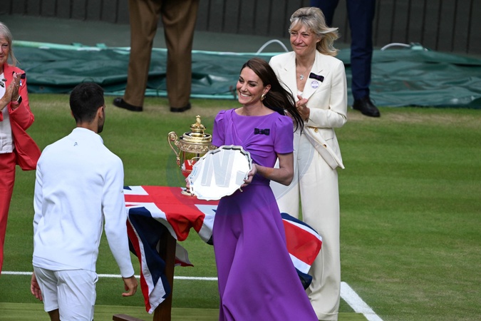 Catherine (Kate) Middleton wręcza puchar Carlosowi Alcarazowi po jego zwycięstwie nad Novakiem Djokoviciem w finale turnieju Wimbledonu 2024 (6.2. - 6.2. - 7.6