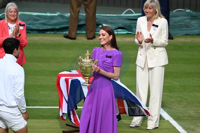 Catherine (Kate) Middleton remet la coupe à Carlos Alcaraz après sa victoire face à Novak Djokovic en finale du tournoi de Wimbledon 2024 (6/2 - 6/2 - 7/6)