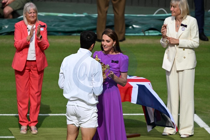 Catherine (Kate) Middleton remet la coupe à Carlos Alcaraz après sa victoire face à Novak Djokovic en finale du tournoi de Wimbledon 2024 (6/2 - 6/2 - 7/6)